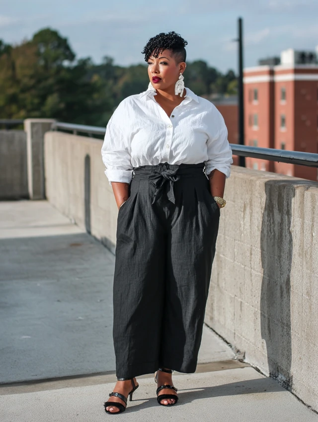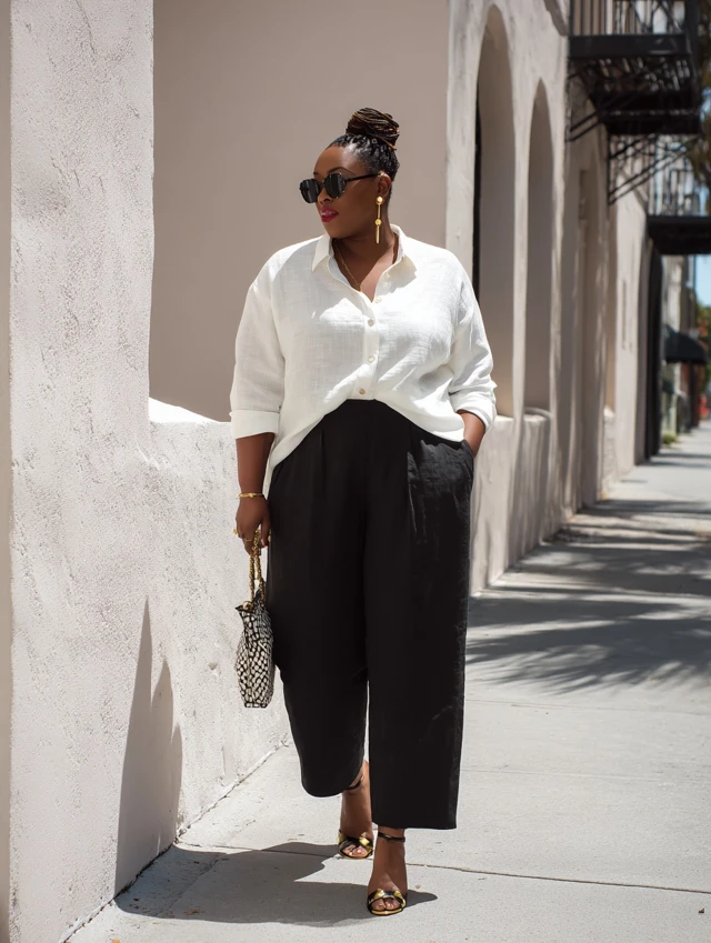 Black linen pants are the perfect mix of casual and refined — a piece you can wear everywhere. They’re breezy enough for hot weather yet sophisticated enough for professional settings, making them a versatile plus-size wardrobe MVP.