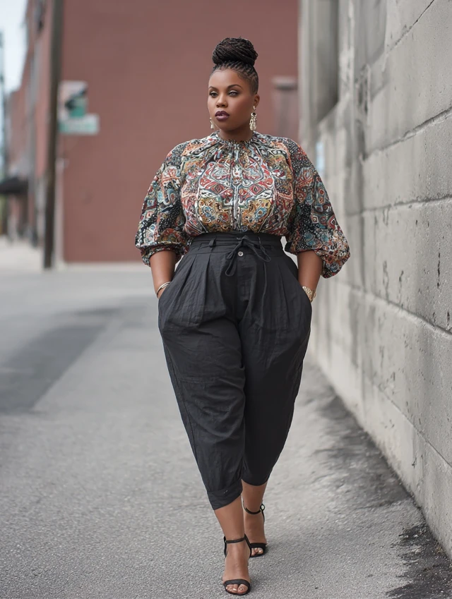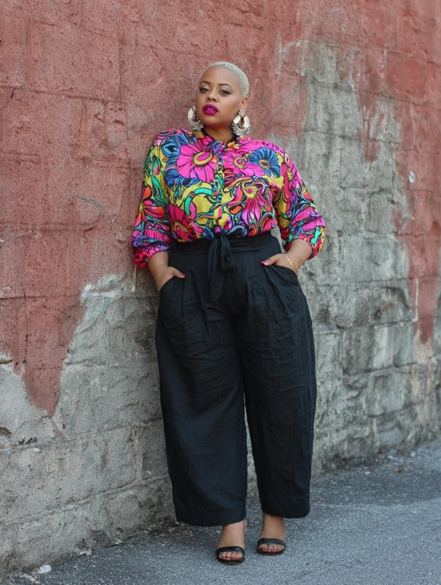 4. Black Linen Pants + Bold Printed Blouse