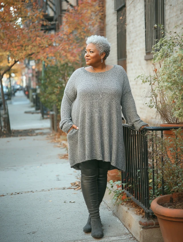 Why It Works: The longer sweater provides coverage while staying stylish.