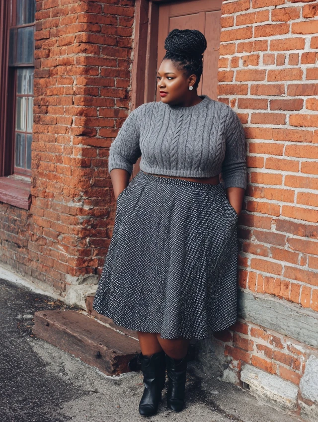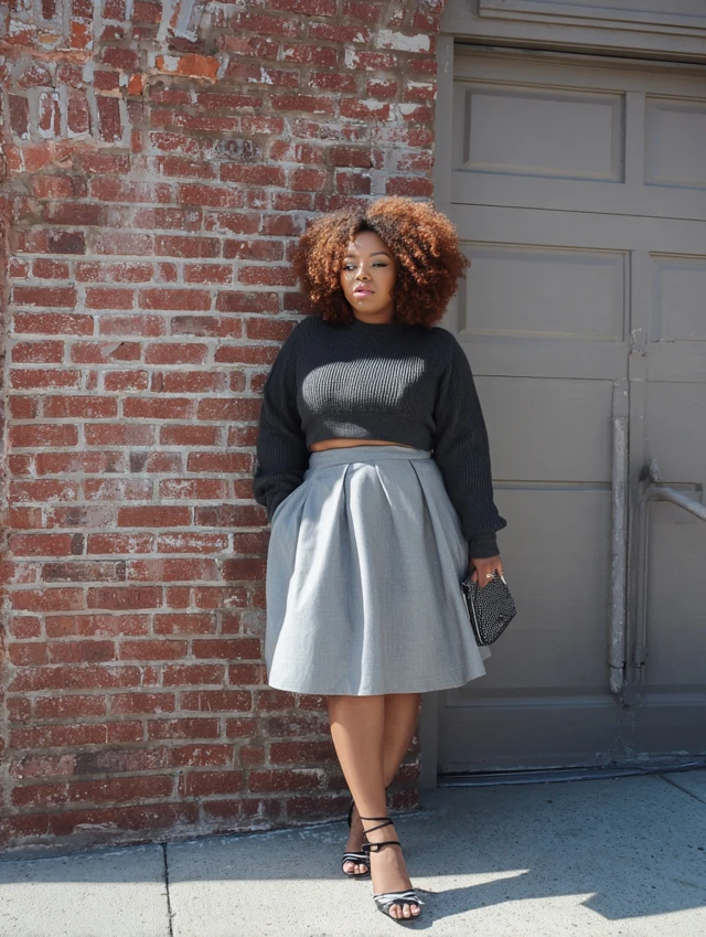 Why It Works: The cropped sweater defines the waist, balancing the flared shape of the skirt.
