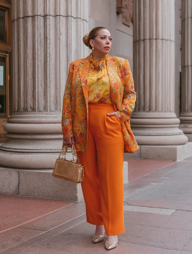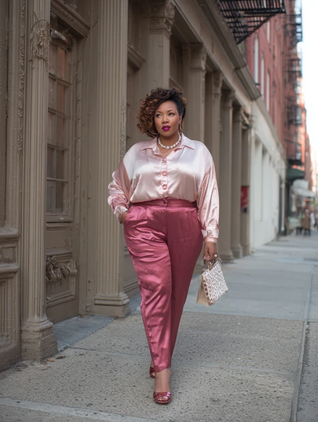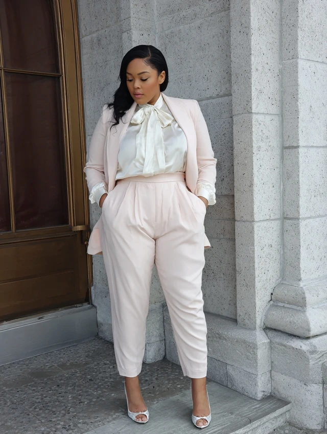 Why It Works: A classic pantsuit is professional yet flattering, and the silk blouse adds softness.