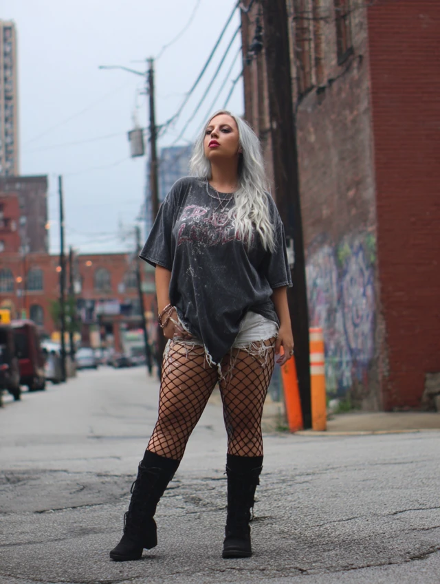 This look thrives on contrast: shiny vs. matte, fishnets vs. leather, lace vs. denim. Black is the base, but don’t shy away from neon pops, leopard print, metallics, or even clashing colors — the chaos is part of the charm.
